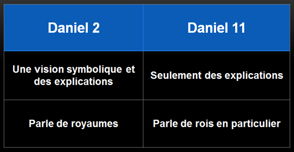 La prophétie biblique c’est simplement l’histoire prédite, et il n’y a aucun chapitre de la Bible où l’on peut trouver plus d’histoire détaillée que dans Daniel chapitre 11. J’aime Daniel chapitre 11 parce que c’est très détaillé, très précis. Avant de commencer, vous avez besoin de comprendre la différence entre les premières prophéties de Daniel et Daniel chap. 11. Prenons par exemple Daniel chap. 2. Daniel 2, tout comme les chap. 7 et 8, comprend une vision symbolique et une explication. Vous avez le rêve de la grande statue en symbole, et ensuite il y a une explication : « C’est toi qui est la tête d’or. Et après toi il s’élèvera un autre royaume, inférieur à toi; puis un autre troisième royaume, d’airain » etc. (versets 38, 39). C’est donc une vision symbolique et après cela il y a une explication qui suit. C’est la même chose avec le chapitre 7. Vous avez les quatre bêtes et la petite corne, et ensuite Daniel donne l’explication. C’est également la même chose pour le chapitre 8. Mais lorsque nous arrivons à Daniel 11 il n’y a pas de vision symbolique, c’est seulement des explications. D’ailleurs, tout ce qui se trouve après Daniel 8:14 ne sont que des explications. Daniel 8:14 est le point culminant du livre en termes de structure littéraire. « Et il me dit : Jusqu’à deux mille trois cents jours ; puis le sanctuaire sera purifié. » Tout ce qui est après cela ce sont des explications. Daniel 11 n’est pas une vision symbolique. C’est donné dans un langage simple. Ces paroles signifient exactement ce qu’elles disent. Cela ne fait qu’expliquer. L’autre différence entre Daniel 2 et Daniel 11 c’est que Daniel 2 parle de royaumes – Babylone, la Médo-Perse, la Grèce, Rome et le royaume de Dieu. Daniel 11 ne parle pas de royaumes du tout, cela parle de rois en particulier, de souverains, de personnes qui étaient à la tête de ces royaumes. Dans Daniel 11 nous sommes très précis au sujet des individus.