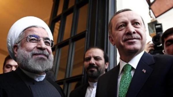 Lorsqu’Erdoğan est allé en Iran, lui et le président iranien Hassan Rohani [à gauche] ont fait alliance pour collaborer dans l’objectif de réunir le monde musulman. {Ibid.}