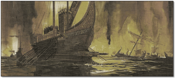 Pour faire court, après qu’Antoine et Cléopâtre ait organisé leur arsenal, ils avaient à la fois des hommes d’infanterie et leur marine. Le vaisseau de Cléopâtre était fantastique et splendidement paré. Les navires d’Antoine étaient eux aussi merveilleux. Ils avaient la majorité contre Auguste. Mais Cléopâtre était bien sur une femme, et, alors que la bataille ne faisait que commencer, elle a fait virer de bord sa galère et s’est retirée. Cela a démoralisé toute l’armée égyptienne, la marine et Antoine lui-même, parce qu’il s’était entiché d’elle. Elle tournait son navire vers l’Égypte, donc il a fait la même chose. Auguste a ensuite défait toute la flotte égyptienne. Quand les armées ont entendu parler de ce qui se passait, elles se sont rendues à Auguste, et, enfin, Cléopâtre et Antoine se sont suicidés.