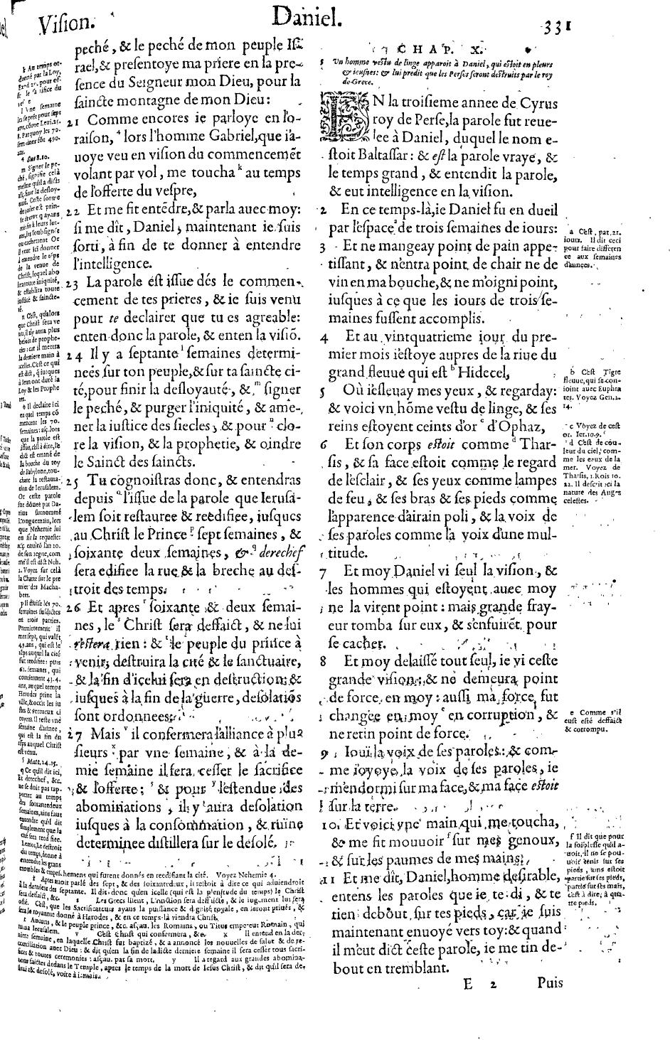 [Ce passage (Daniel 9:27) est l’un des plus difficiles à traduire ; cette traduction, quasi-identique à la King James, est inspirée en grande partie de la Bible de Calvin (de 1564)1. Il nous semble évident que l’expression « l’étendue des abominations » est une description, non seulement de la désolation infligée par l’Empire romain, mais des deux désolations qui existeraient : la Rome païenne (l’Empire romain) et la Rome papale (l’Église catholique romaine). Ces deux « empires » désoleraient le peuple de Dieu, et le deuxième serait à l’origine des plus grandes persécutions ayant jamais été enregistrées dans l’histoire. Ce dont il est question dans la dernière partie du verset est comme une moisson de conséquence, conformément à Gal. 6:7. Ce qui est déterminé par la Providence divine sera finalement versé sur le désolateur]
