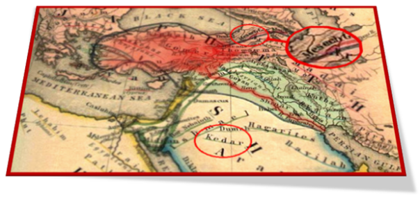Qui est Kédar ? Le fils d’Ismaël, qui était le fils d’Abraham par la servante égyptienne. Et qui sont-ils ? Le monde musulman tout entier ne porte-t-il pas son attention vers Mohammed qui prétendait être un descendant direct d’Ismaël ? C’est le monde musulman tout entier, le monde arabe, qui est identifié ici comme Kédar. Si vous regardez une ancienne carte pour trouver où se trouve Kédar, vous le verrez exactement là à côté du fleuve de l’Euphrate.