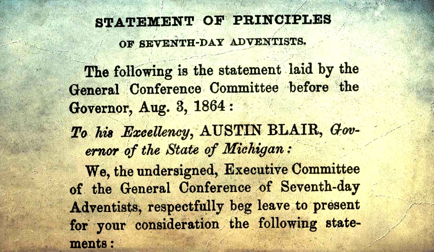 La confession chrétienne des Adventistes du septième jour, qui adopte la Bible comme règle de foi et de pratique, est unanimement d’avis que ses enseignements sont contraires à l’esprit et à la pratique de la guerre ; c’est pourquoi elle s’est toujours opposée consciencieusement au fait de prendre les armes. S’il y a une partie de la Bible que nous, en tant que peuple, pouvons citer plus qu’une autre comme notre credo, c’est la loi des dix commandements que nous considérons comme la loi suprême et dont nous prenons chaque précepte dans sa signification la plus évidente et la plus littérale. Le quatrième de ces commandements exige la cessation du travail le septième jour de la semaine, le sixième interdit d’ôter la vie, et ni l’un ni l’autre, à nos yeux, ne peuvent être observés dans l’accomplissement du devoir militaire. Notre pratique a toujours été conforme à ces principes. C’est pourquoi nos fidèles ne se sont pas sentis libres de s’enrôler dans l’armée. Dans aucune de nos publications confessionnelles, nous n’avons préconisé ou encouragé à prendre les armes ; et lorsque nous avons été appelés sous les drapeaux, plutôt que de violer nos principes, nous nous sommes contentés de payer, et de nous aider les uns les autres à payer, les 300 dollars correspondant à la somme de commutation. »