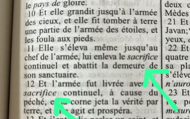 Nous devons noter afin de bien comprendre ce verset et tous les autres qui parlent du [sacrifice] continuel, que le mot « sacrifice » est en italique, ce qui veut dire qu’il a été ajouté par les traducteurs (comme on le voit dans l’exemple ci-dessous tiré de la Bible Ostervald).
